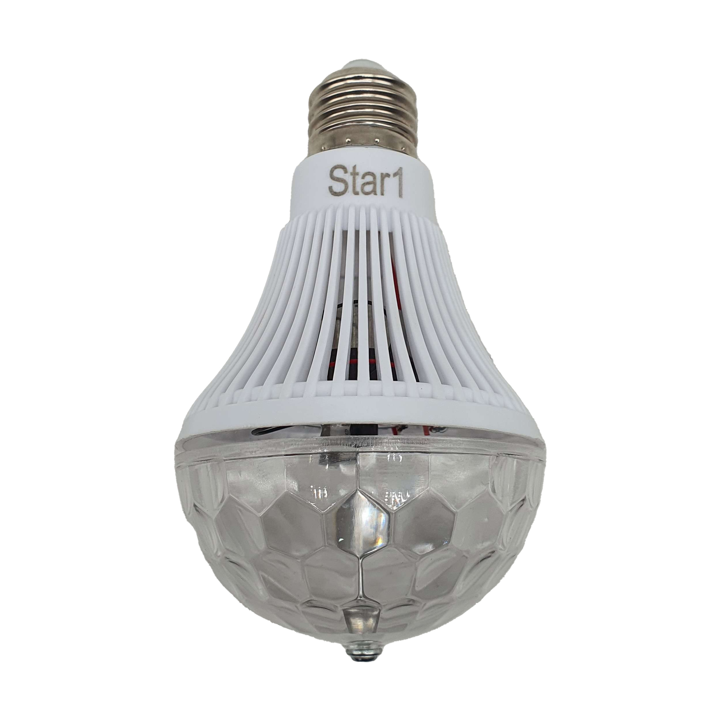 لامپ رقص نور گردان از برند استاروان با ظاهری لامپ گونه به وسیله سرپیچ معمولی به پریز برق متصل می شود که در زمان اتصال به برق قسمت بالای لامپ می چرخد و با تابش نور به صورت RGB جلوه ی خاصی ایجاد می کند. مناسب برای جشن ها و میهمانی ها لامپ رقص نور استاروان دارای سه نور گردان قرمز ، سبز و آبی میباشد. که تلفیقی از آنها فضای زیبایی برای شما مهیا میکند این محصول کم مصرف بوده و حدودا 100 متر مربع را پوشش میدهد