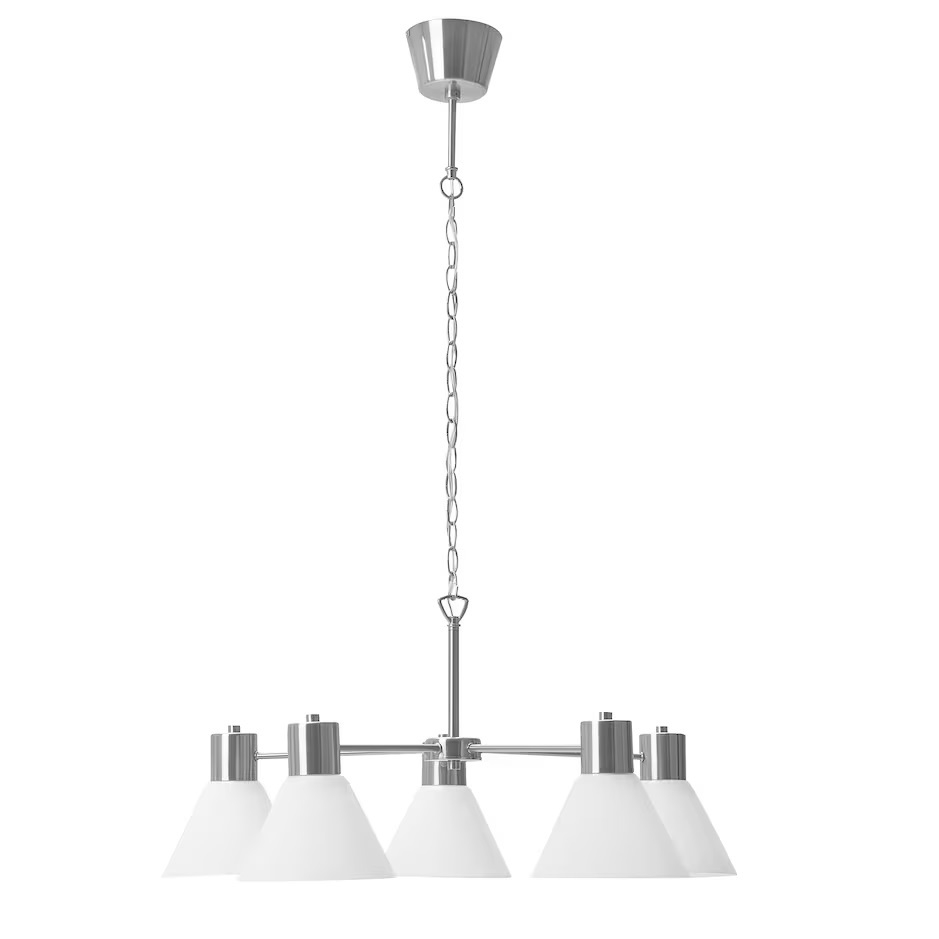 تنظیم ارتفاع با استفاده از قلاب S یا برش زنجیر آسان است.ستر 5 بازو با خطوط تمیز و آباژورهای دهان دمیده در شیشه مات مناسب اکثر سبک ها است و نور ملایم و دلپذیری را در اتاق شما پخش می کند.