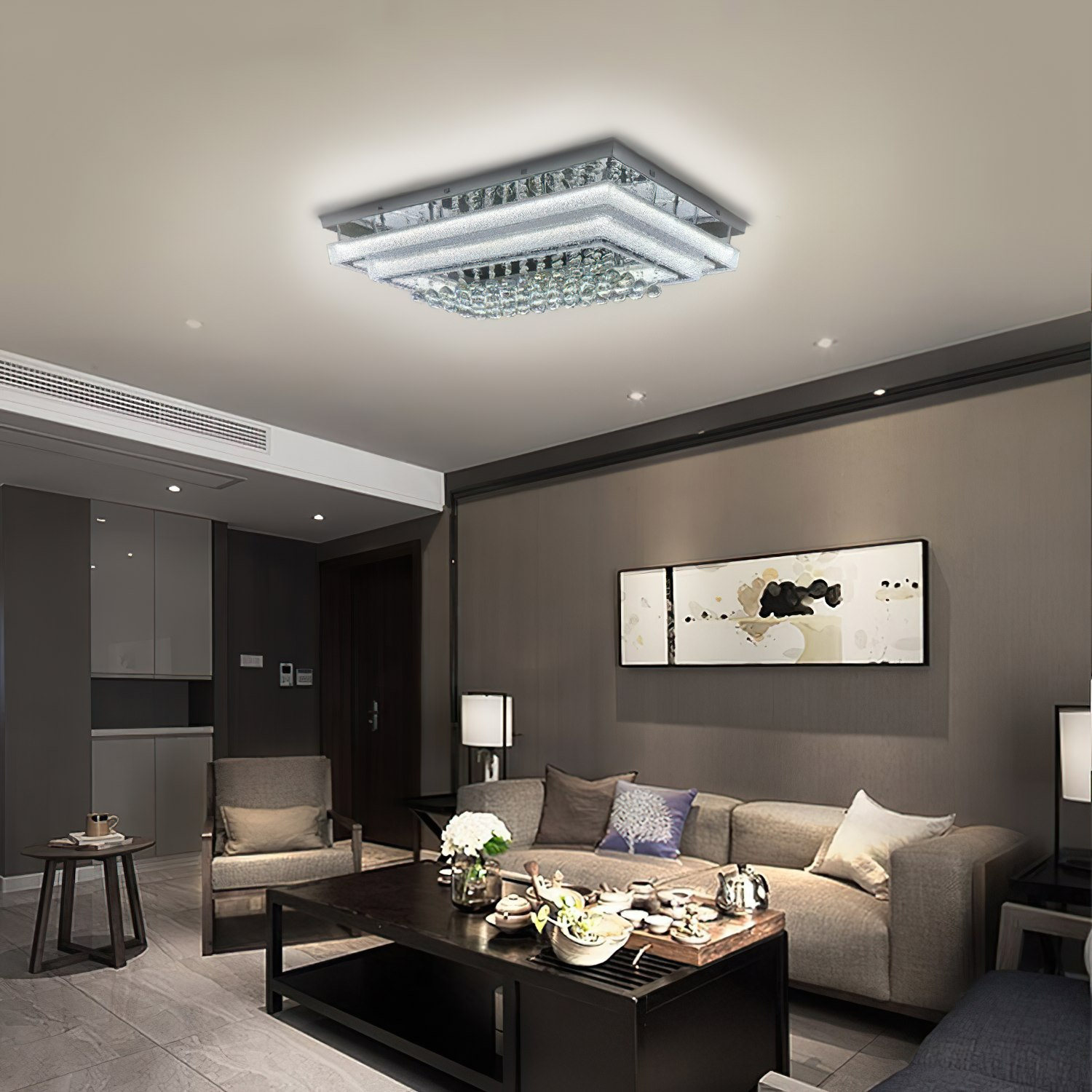 لوستر مدل مدرن طرح مستطیل باطراحی شیک و مینیمالیستی انتخابی ایده آل برای کسانی است که دنبال ترکیبی از زیبایی و کارایی در دکوراسیون منزل خود هستند جنس بدنه این لوستر ترکیبی از استیل و شیت کریستالی پلی استایل. مقاوم گرما و سرما ساخته شده است که برای زیبایی بیشتر در مرکز لوستر از کریستال درجه یک و شفاف ترکیبی از مات و شفاف طراحی شده است. که در مرکز آن از 12عدد سرپیچ لامپ لوستر بکار رفته است برای نوردهی بیشتر پدر حلقه ها از نوار ال ای دی چهار رنگ با ریموت کنترل هوشمند ساخته شده است