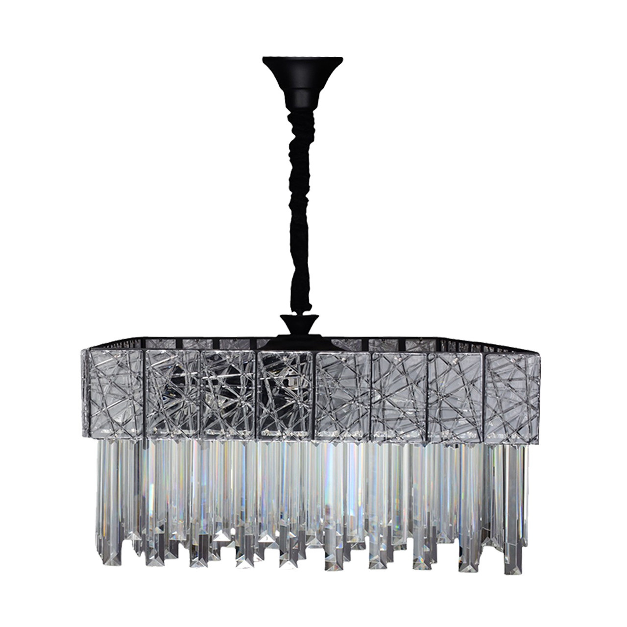 این لوستر کریستالی با طراحی ظریف و رنگ مشکی، تلفیقی از مدرنیته و طراحی کلاسیک را به فضای شما میآورد. ترکیب منحصربهفرد رنگ مشکی بدنه و چیدمان منظم و یکپارچه کریستالهای شفاف، این لوستر را به انتخابی بینظیر برای دکوراسیونهای مدرن و مینیمالیستی تبدیل کرده است. نقشهای ظریف کریستال های نصب شده بر روی فریم این لوستر، زیبایی آن را دوچندان کردهاند. این نقشها با دقت فراوان طراحی شدهاند و با بازتاب و شکست نور از زوایای مختلف، جلوهای شیک و منحصربهفرد از بازی نور و سایه ایجاد می کنند.