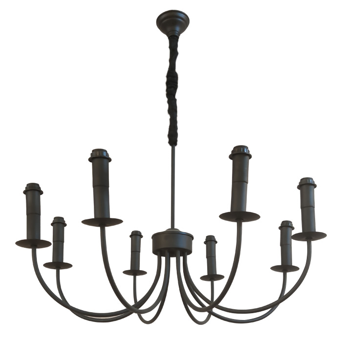 لوستر 8 شعله مدل GN8 دارای متریال فلزی است و رنگ آن از نوع استاتیک کوره ای است. قطر این لوستر ساده و زیبا 60 سانتی متر است. GN8 دارای 8 شعله از نوع شمعی یا E14 می باشد.