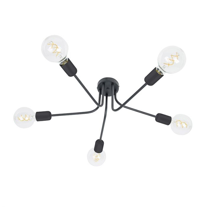 لوستر ۵ شعله سقفی ساده و کارامد از جنس فلز سبک می باشد.بازوها متحرک هستند.قطر لوله بدنه یک سانتی متر و قطر کفی گرد متصل به سقف ۱۰ سانتی متر است. بخاطر اینکه شاخه ها به همه جهت ها هستند باعث می شود نور بخوبی در محیط پخش شود یعنی مثلا اگر از لامپ LED با توان ۱۰ وات استفاده کنید ۱۵ متر مربع را یک عدد از این لوستر بخوبی تامین نور می کند.