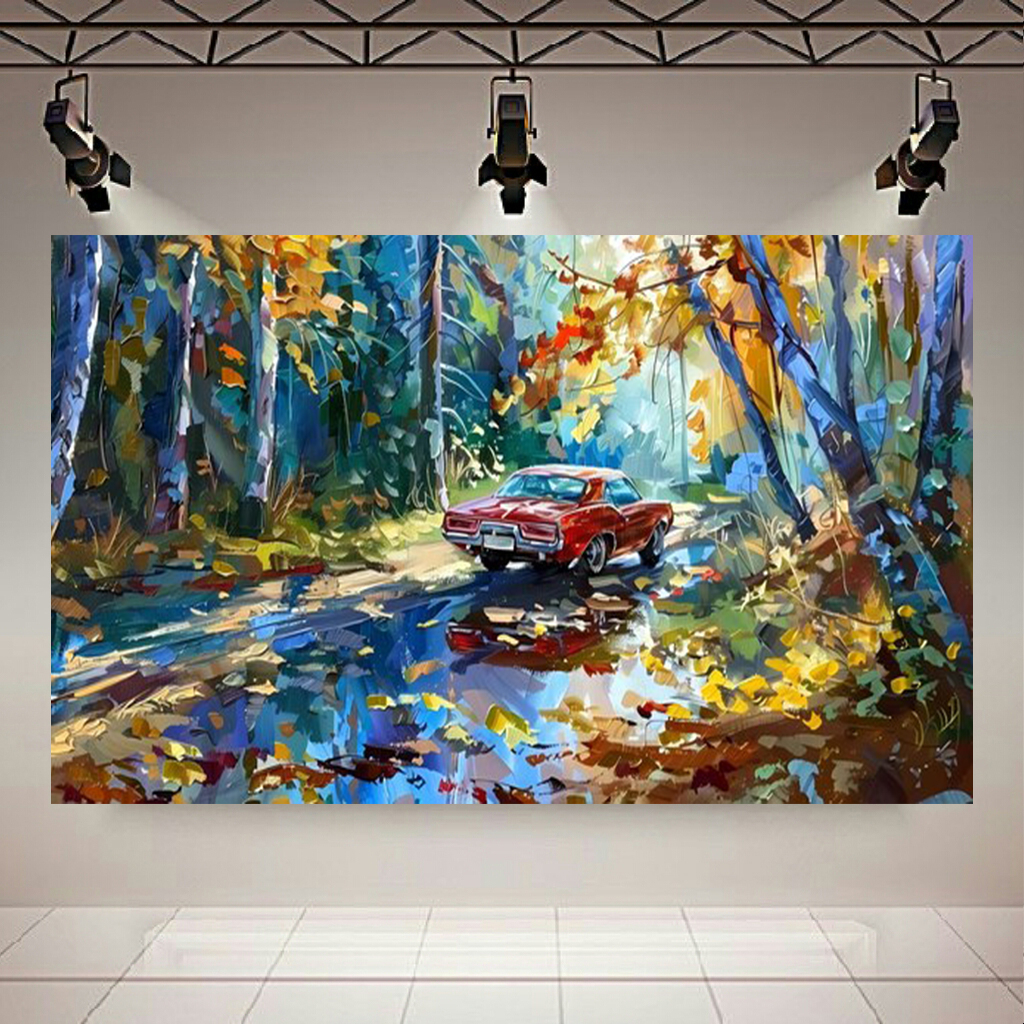 کاغذ دیواری طرح رنگ روغن جنگل پاییزی مدل ماشین کلاسیک کد AR304105