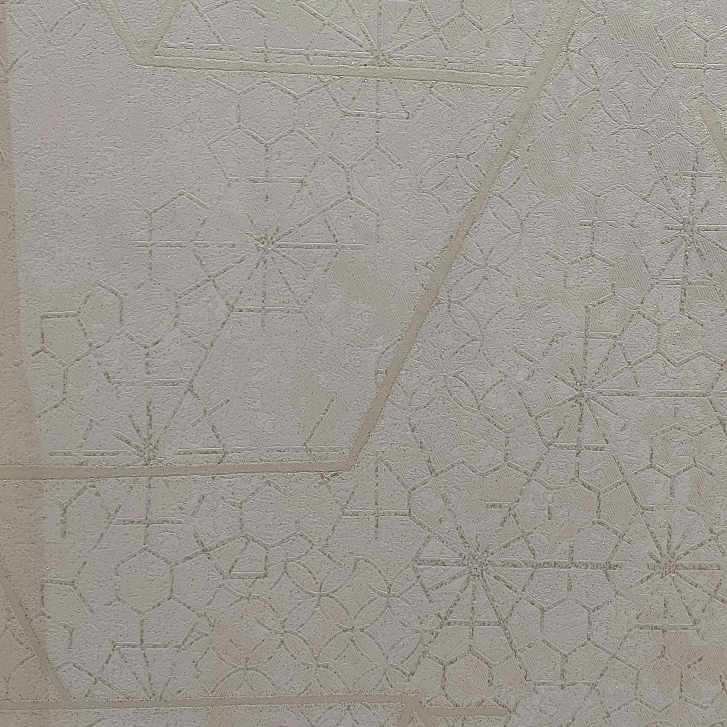 کاغذ دیواری سه لایه پی وی سی وارداتی از کشور چین با کیفیت مناسب و قابلیت شستشو می باشد. رنگ آن کرم روشن با اکلیل طلایی می باشد. استفاده از اشکال هندسی در طراحی این مدل را از سایر مدلهای مرسوم کاغذدیواری همانند پتینه و داماسک متمایز کرده است.