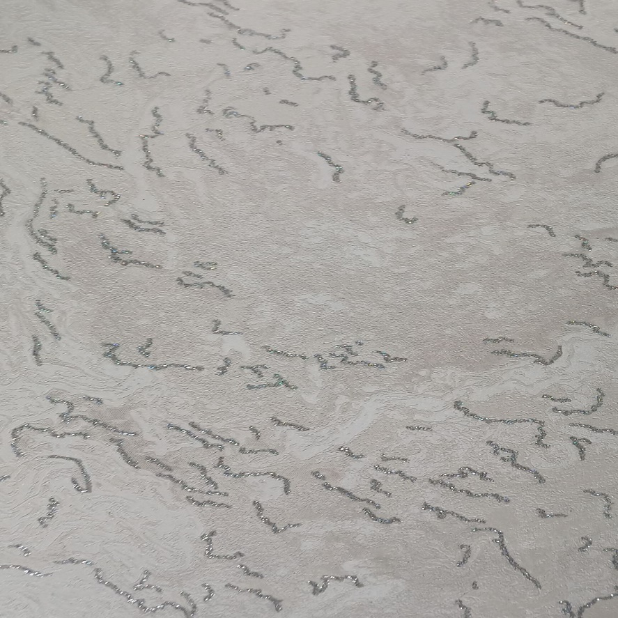 کاغذ دیواری قابل شستشو – زمینه ی طوسی روشن با طرح طوسی نقره ای و دارای طرح های برجسته و اکلیل میباشد که زیبایی منحصر به فردی به فضای اتاق ها و دیوارهای سالن خانه ی شما میدهد