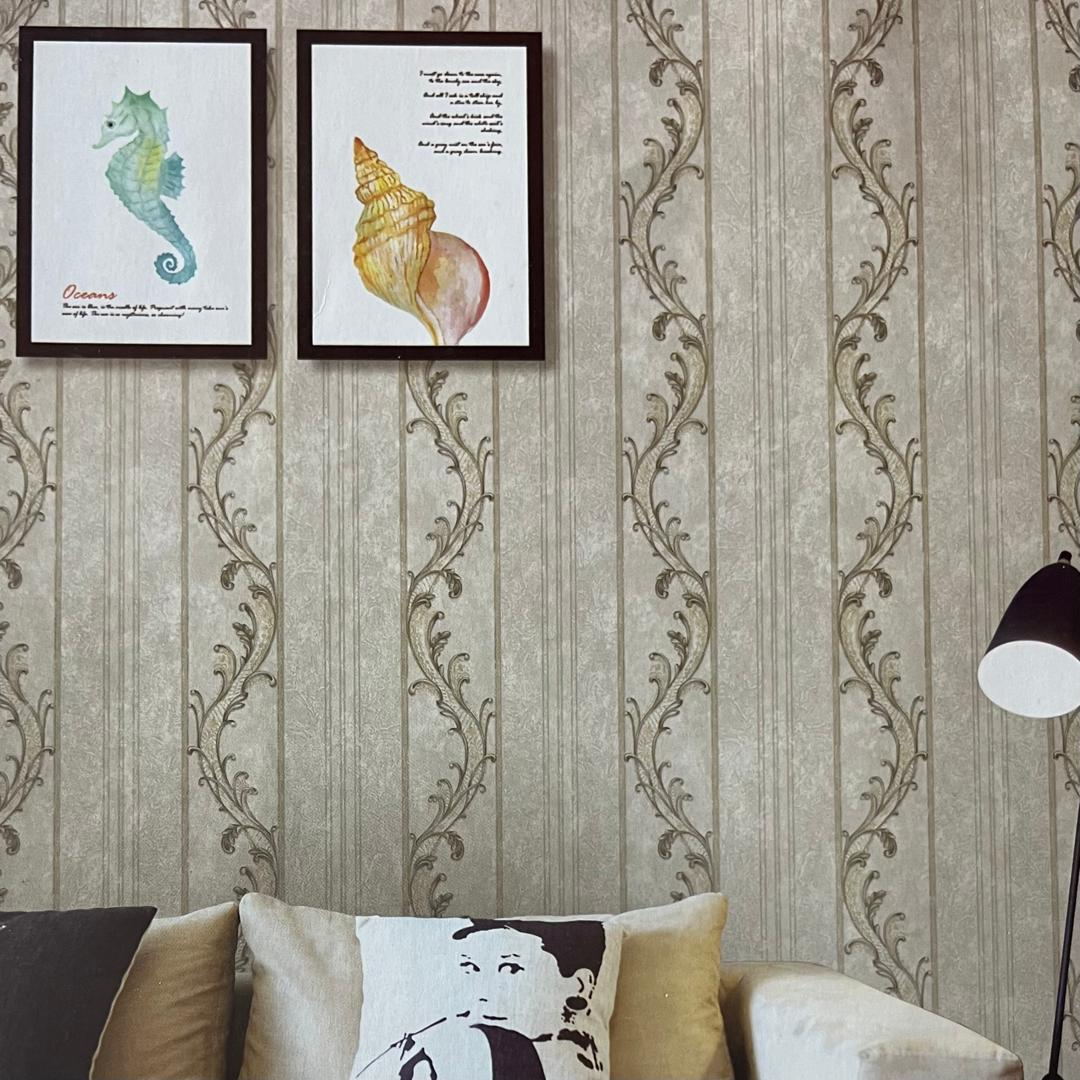 کاغذ دیواری طرح کلاسیک کد 2104 زمینه پتینه طوسی با گل قهوه ای طرح برجسته روکش پی وی سی ( pvc ) . مناسب برای دیوار اصلی سالن و اتاق خواب . دارای اکلیل ( شاین )